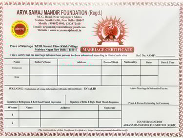 A Marriage Certificate is an official document issued by the Marriage Registrar in Delhi that legally validates a couple’s marriage under the Hindu Marriage Act, 1955 or the Special Marriage Act, 1954.